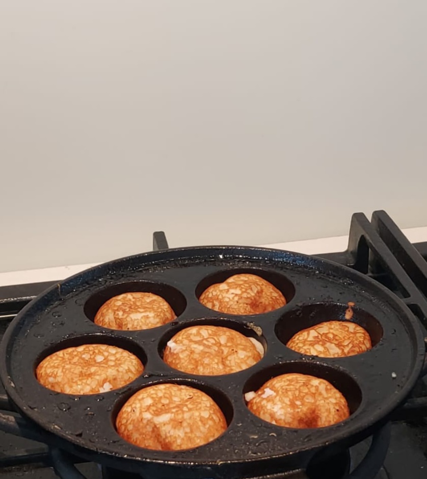 Pour the batter in every hole. Cook until it starts bubbling then flip it over to cook the other side.