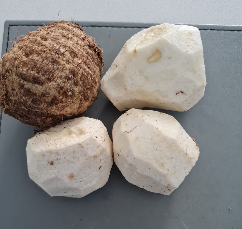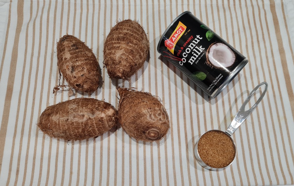 Cut the cocoyams into pieces and place them into a pan. Add an appropriate amount of water and a pinch of salt to enhance the flavor.